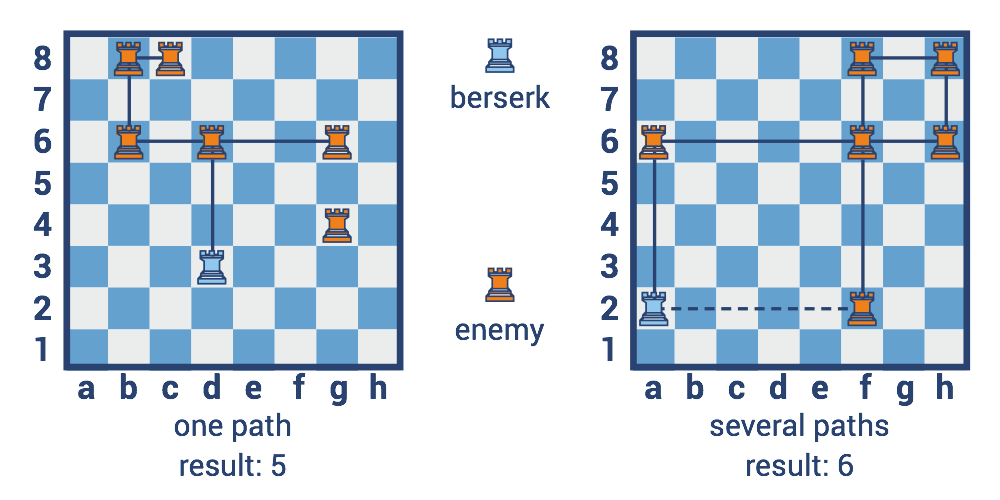 For this mission you have one berserk rook facing off against an army of enemy rooks. The berserk rook can only move if it will capture an enemy unit. So on each turn it will move and capture until there are no enemy targets left where it will take one "empty" step and stop. You are given the position of your berserk rook and the positions of the enemy rooks. Your goal is capture as many units as possible without stopping. Each move in your sequence should capture an enemy unit. The result will be the maximum possible number of enemy rooks captured.