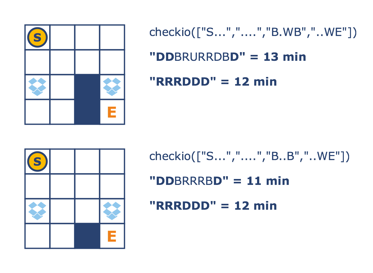 checkio(["S...","....","B.WB","..WE"]) == "RRRDDD" checkio(["S...","....","B..B","..WE"]) == "DDBRRRBD"